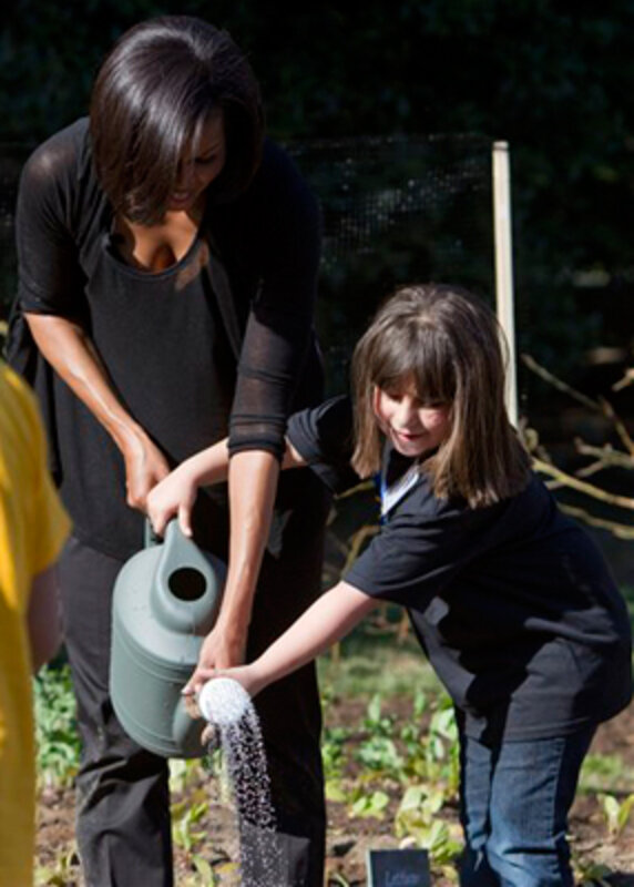 Mrs. Obama was joined on the South Lawn of the White House by third- through sixth-grade students from Bancroft Elementary School in Washington and Hollin Meadows Elementary School in Alexandria, Va. Both schools have gardens that Mrs. Obama has visited.