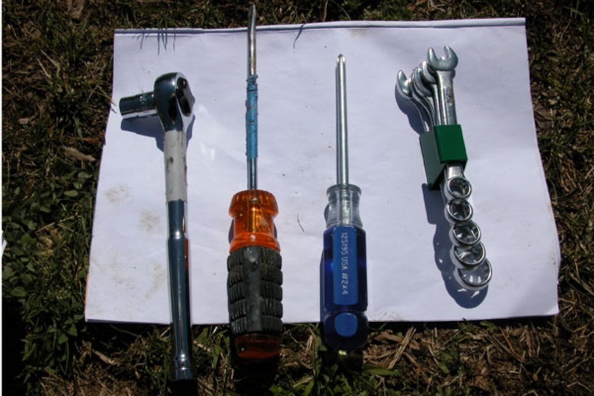 I figured that with their help (for a day鈥檚 wage) we could get the whole greenhouse up on a weekend.聽 The manual said that two people could do it in that time.聽 And the only tools we'd need 鈥 after the unmentioned backhoe, concrete mixer, and plastic pipes, of course - were fairly simple: a level, a socket spanner, two screwdrivers - one slotted, one Phillips - and a silicone pistol.