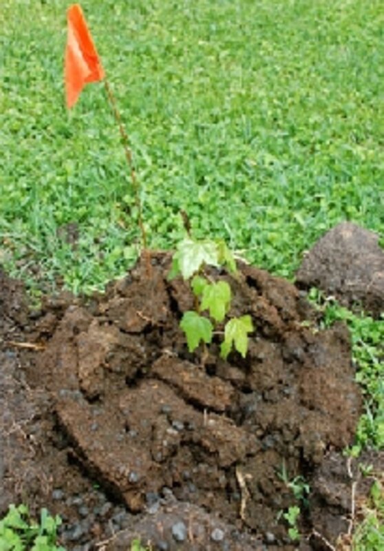 Brightly colored construction flags (see photo at right, above) will direct my eye so that I can find them when they need watering and avoid them when the pasture needs mowing. And to cut down on the watering trips, I have surrounded each tree with a dollop of moisture-conserving mulch, which I buy by the truckload 鈥 again to save money.