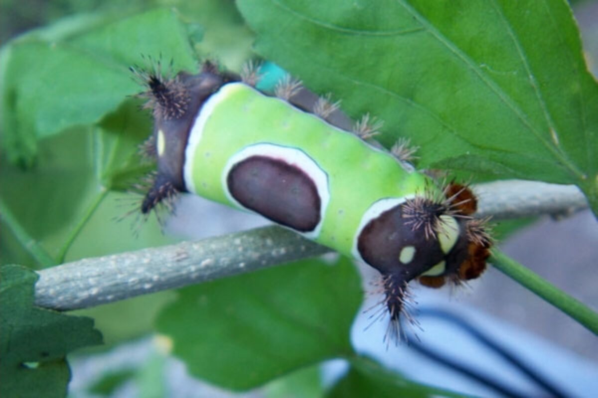 While all the members of this family are all unusual looking and have stinging hairs, the saddleback is my favorite because I love chartreuse in the garden, and this one has a chartreuse saddle.