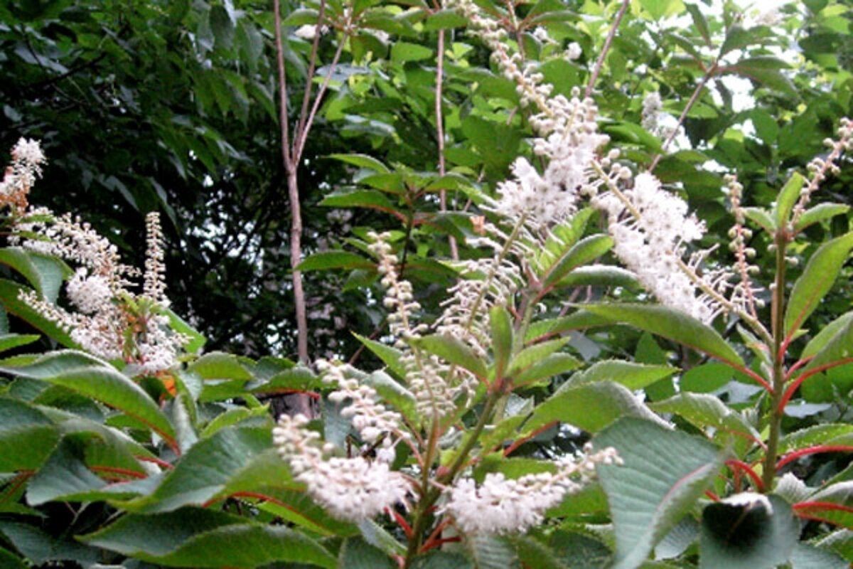 Japanese clethra (see first photo above) looks more exotic, with its angled clusters of sweetly fragrant white flower spikes, dark green leaves, and exfoliating gray and brown bark. Mine is about 10 feet high with an open habit typical of shrubs and trees grown in shade.