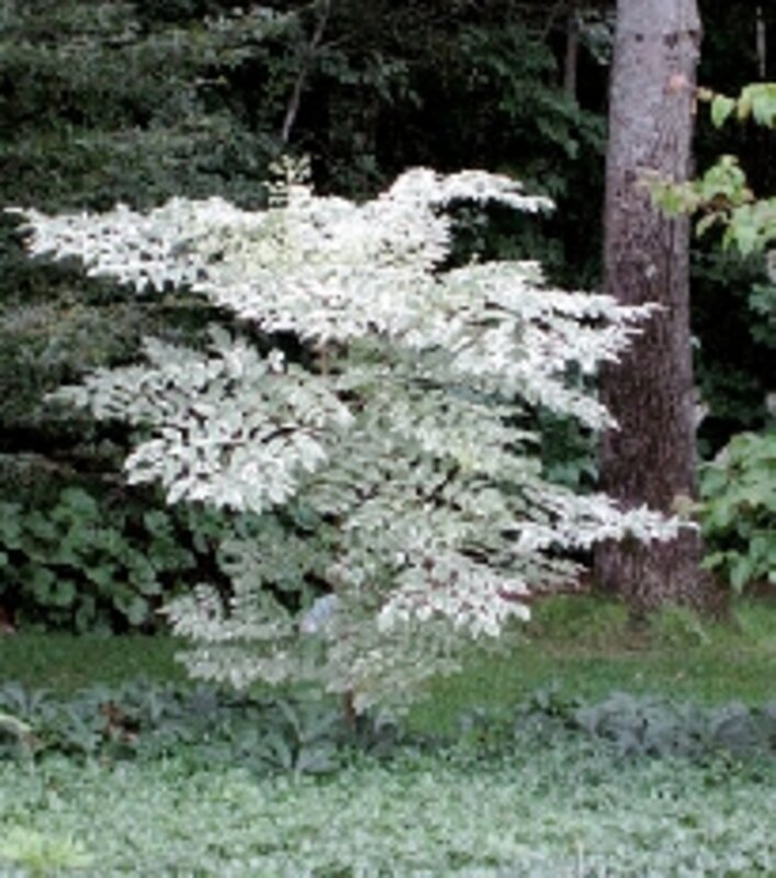 A (Aralia elata 鈥榁ariegata鈥) looks almost white against the dark wooded background. And shade-tolerant woodies like (Clethra berbinervis), (Aesculus parviflora), and (Hydrangea arborescens 鈥楢nnabelle鈥 produce ample white flowers for a similar lightening effect.