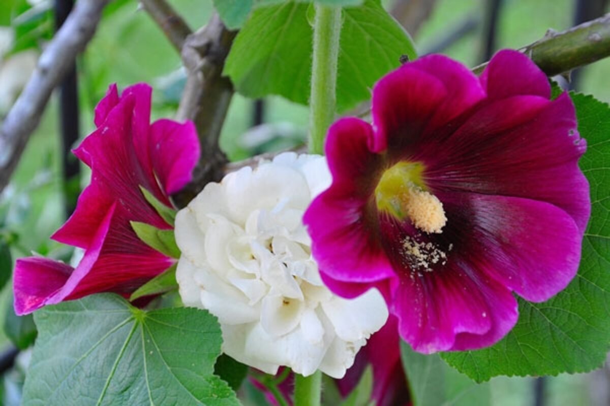 My are volunteers growing in a small trellised bed that's home to three climbing roses and several miniature climbers. One of the roses, White Dawn, is a sport of the popular pinkish New Dawn, but it doesn鈥檛 rebloom as dependably. In fact, it hardly reblooms at all. So this afternoon, the sight of a single White Dawn appearing between two late hollyhock blooms sent me rushing for the camera. (See photo above.)