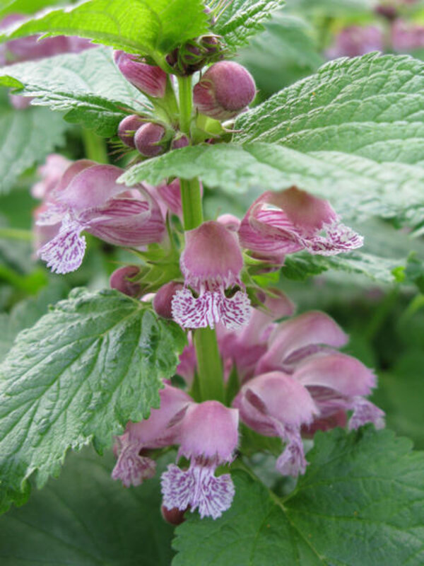 With its dense gray-green foliage, it looks good even out of bloom --- and yet, the blooms, on close-up, are spectacular. This easy-going cousin of our native dead nettles sends up intriguingly beautiful whorled spikes of rosy-pink, hooded, orchid-like flowers in late spring.