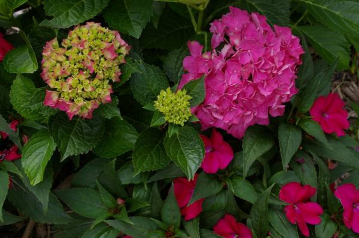 鈥楶ink Shira鈥 hydrangea [see Phonto No. 2 above] exploded with huge blooms in May and flowered until the third killing freeze of October. Buds started chartreuse; unfurled to hot pink edged with the green, and fully bloomed in electric mauve. Plants had the three stages of blooms on them all at once.