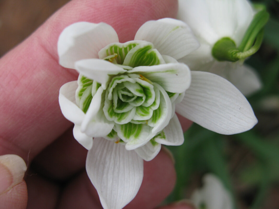 Of course, there was the double form, readily available, G. nivalis 鈥Flore Pleno鈥 [see second photo above]. But I also saw the much treasured , a double flowering nivalis with buttery yellow inner petals, which is popular because of its all-green petals, , a vigorous bunch, with large blooms on very long flower stalks, and , so named because the green spots on the inner petals supposedly look like tailor鈥檚 shears 鈥 takes a bit of imagination, but it鈥檚 there.