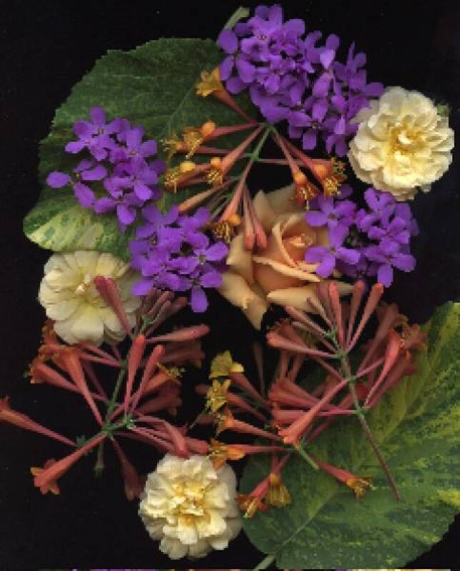 Early summer brought the flowers of Hesperis (), a rose (Ghislaine de Feligonde 鈥 I bought it for the name), 鈥楪oldflame鈥 honeysuckle, the Buck rose 鈥榃inter Sunset,' and leaves from the variegated tree Viburnum lantana.