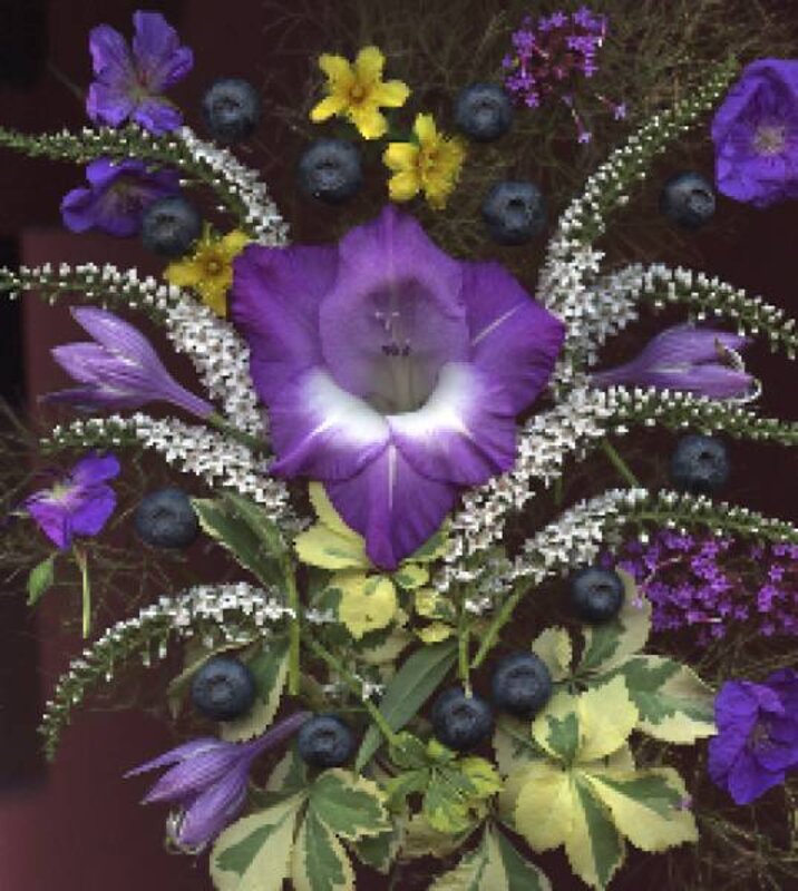 Well into this form of entertainment by July, I composed a picture for my friends as a Fourth of July greeting. It contained a sparse crop of blueberries, the variegated leaves of the aralia, Eleutherococcus, gooseneck loosestrife, St. John鈥檚 wort, hosta flowers, and , along with a delicious gladiolus.