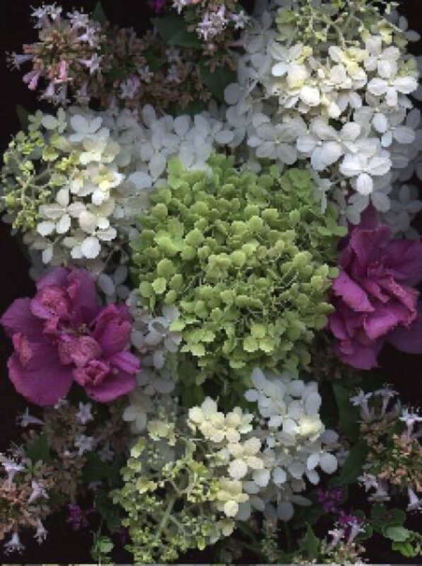 As the PG hydrangea began blooming, I took a summer picture. Beautiful green Hydrangea arborescens 鈥楢nnabelle,' the starchy white of the PG hydrangea, the long-blooming Chinese abelia, and my double pink Rose of Sharon.
