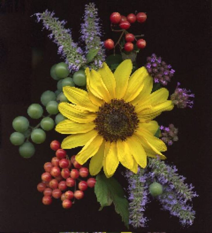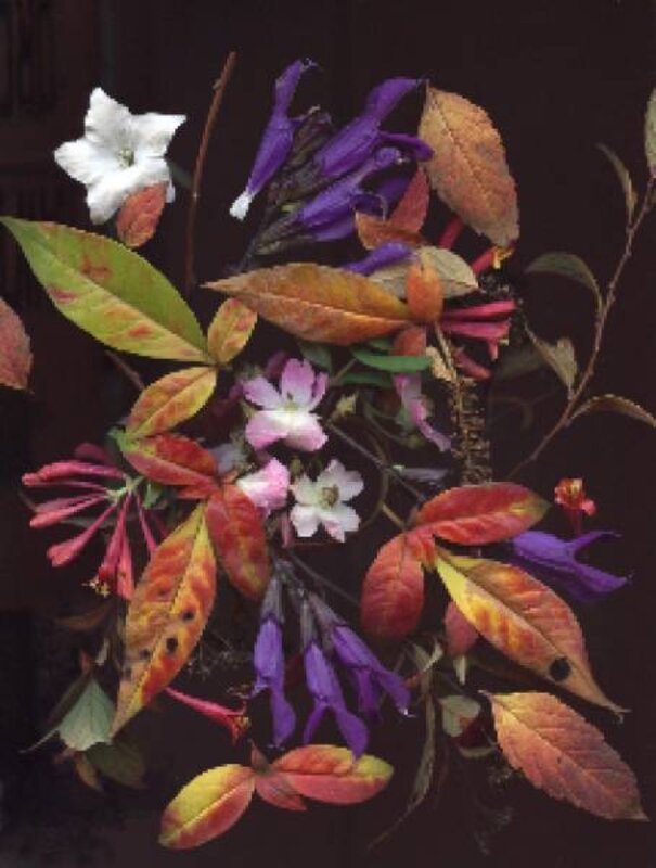 I walked around the garden on any given day, picking up blossoms and beautiful leaves, plants blooming at the same time, and scan them into a picture I can save.
