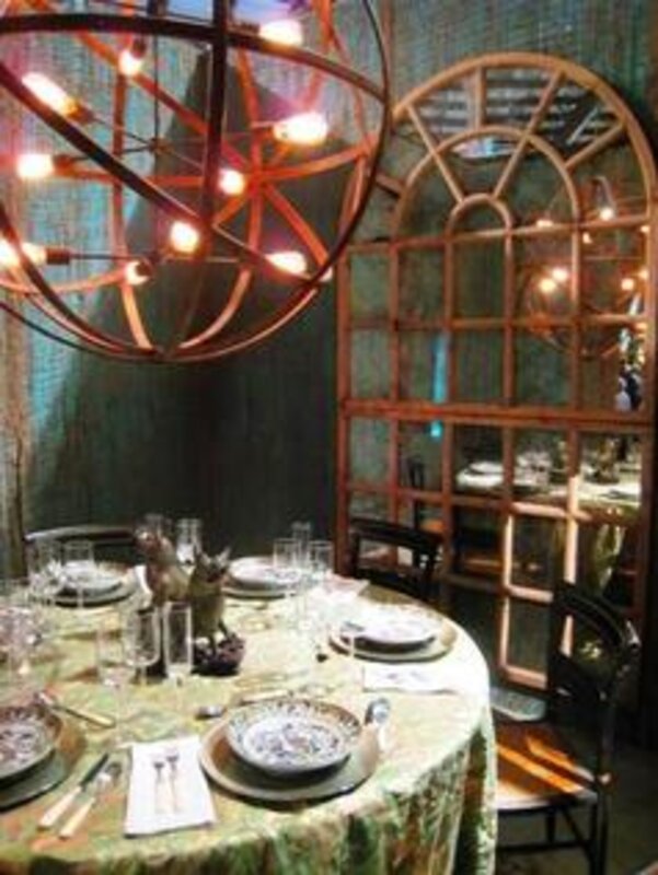 When I finally hopped along the rough textured stones, I entered the room through a narrow Gothic-arched doorway. Slit windows in the walls allowed for vistas beyond the interior, which was decorated as a charming dining room, complete with a chandelier, curving chairs and a table laid with antique china.