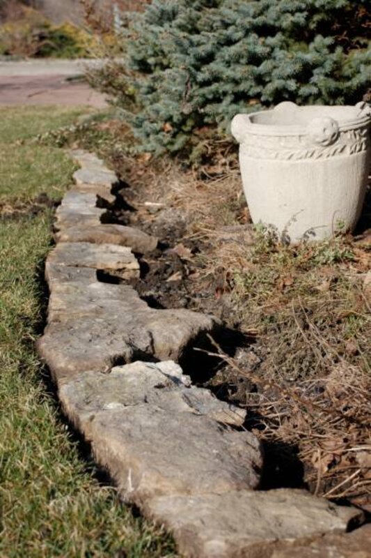 I removed some limestone edging and dug out about a foot wider in what I knew to be a now-barren section of the front yard where evergreens had crowded out and shaded whatever was there to begin with. The removed sod went to fill a depression where an old septic tank had been removed (a long, nasty story).