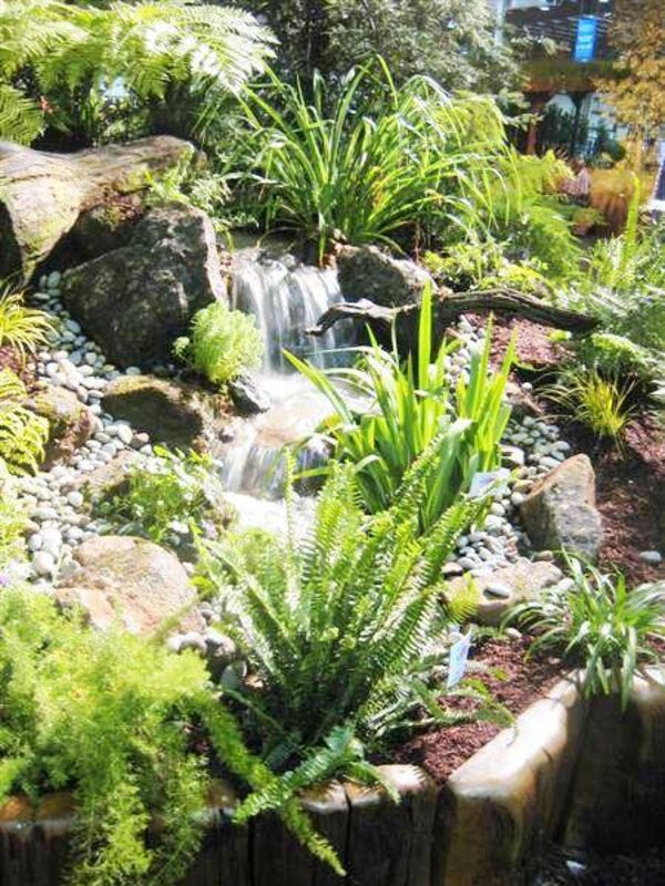 The cheerful sound of the water flowing and the use of river rocks and tree limbs in the streams created a satisfying gardening experience that, with the right screening, could fit into any backyard setting.