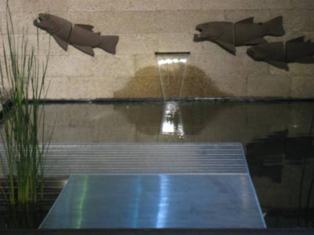 The surrounding plantings, in islands and in containers, both in and out of the water, softened the severe rectilinear approach. Leaping salmon sculptures on the far wall also supplied the balance of curving shapes, and added a hint of levity to all that calm.