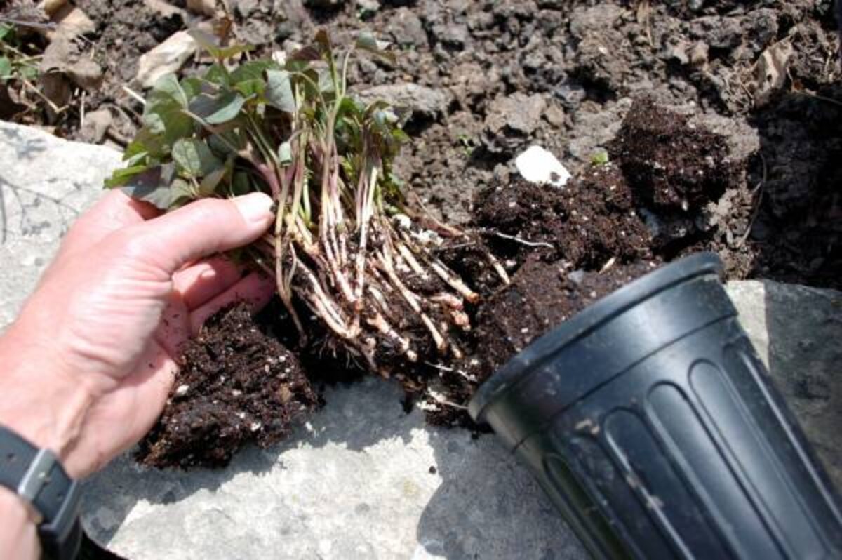 So you will imagine my surprise when I told the nursery owner I wanted to plant sweet potatoes and he handed me a little black nursery pot with what looked like a houttuynia, that wildly spreading ground cover, peeking out of it. [See Photo 1 above.]