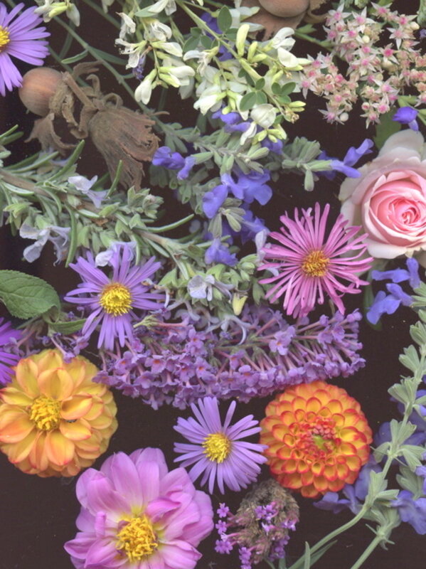 As I began to write this post, rain was forecast and hope was renewed with just the thought of rain, so I went out and picked several flowers to make a scan. [Click here to read about how I do this.] The result is in the first photo at left.