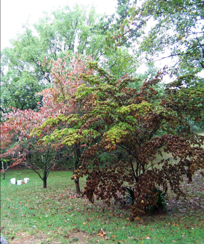 I wanted to show you my Korean dogwood [top photo] that is still alive though wounded by this summer鈥檚 excess. The lower limbs are almost entirely crispy. A bit of green shows on the leaves in the closer photo 鈥 a welcome reminder of life.