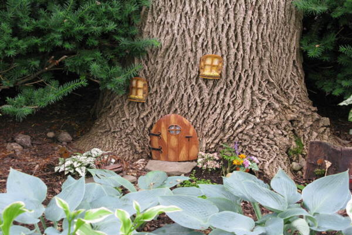 Weatherproof doll-house furniture, miniature glazed ornaments, and a small dish containing water embedded into the surface to resemble a pond can be enticing. A whimsical fairy door at the base of a tree would allow fairies to both leave quickly should danger threaten. [See second photo above.]