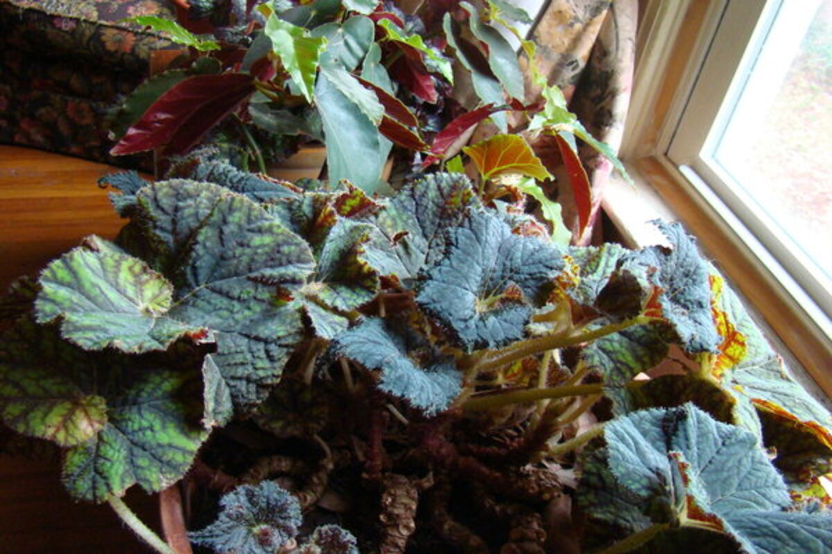Rex types need more humidity, and I provide it the old-fashioned way by filling their saucers with pebbles. Spray the pebbles daily, and humidity around the plants increases. They also need more light to keep their leaf color, readily available in front of the windows on the south side of my house. The friendly RB鈥檚 perch on an old blanket chest in my bedroom alongside cane-type begonias.