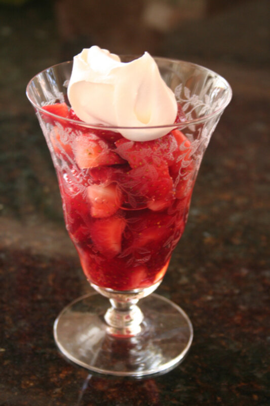 Strawberries Romanoff is one of those very versatile, simple recipes. It becomes another dessert if you layer it with almond macaroons. Just make the recipe, put in a spoon of the strawberries in a pretty glass or crystal bowl, crumble on almond macaroons, layer in little whipped cream, and then strawberries again, and finish with a spoon of cream and sprinkle of almonds. You can layer it as high as you like.