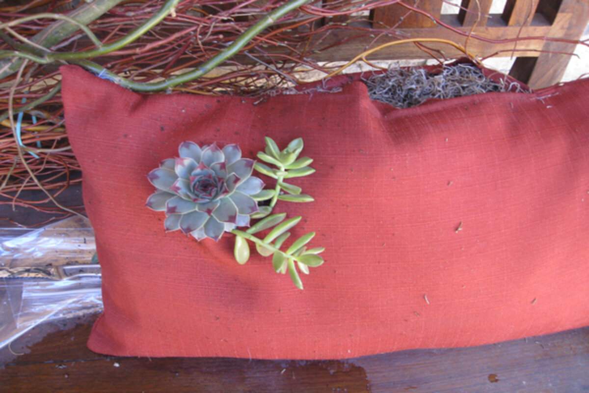 If you like a true pillow look, sew the top seam closed again, leaving some small openings for drainage. I left mine open and crowned the pillow with another plant to serve as a focal point.