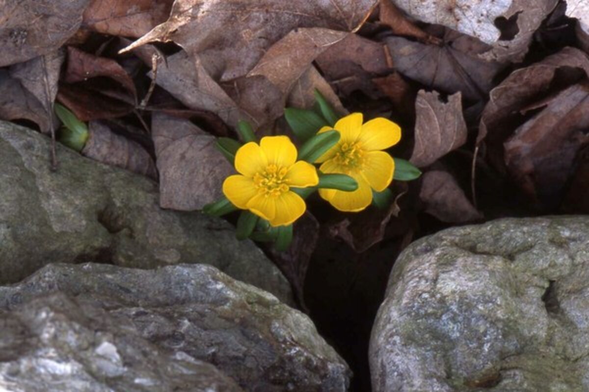 To reflect the colors of the witch-hazels down to soil level, (Eranthus) in its shades of bright yellow warms all the way to the soul on cold winter's day. Only three to five inches in height, including bloom, the six-petal flowers, dressed all in yellow, have a lacelike collar of bright green.