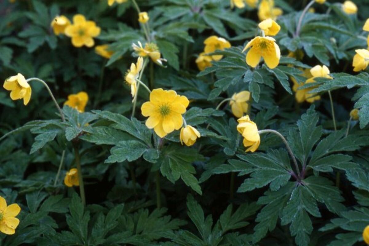 Although , the buttercup anemone [see third photo above], is usually grouped alongside A. nemorosa, they are different species. Both the binomial and common names describe the plant. Both describe a bloom with petals of bright yellow resembling buttercups (Ranunculus). Foliage is the same as A. nemorosa species. There is a fully double form to seek that is just as hardy and reliable in spread as the single blooming. A. r. 'Plena Flora' resembles small yellow buttons carried above the cut foliage.