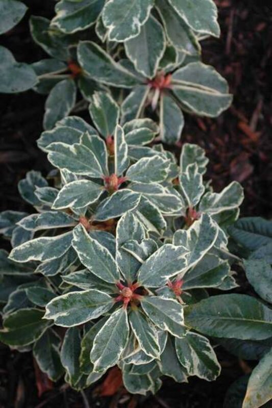 Rhododendron 'Unique Variegated' has a lovely rounded form, cream-colored flowers, and reaches five feet or taller in time. While the normal 'Unique' is known for having even, oval-shaped leaves with a refined, shiny appearance, 'Unique Variegated' has leaves that vary in shape, giving it a more textured look. [See first photo at left.]