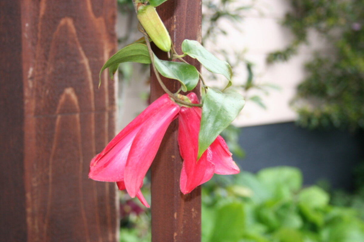 Chilean bellflower, Lapageria rosea, [see two photos above] blooms almost nonstop with gorgeous, tropical-looking hanging bell-shaped flowers that average a whopping four inches in length! The vivid coral-red color shines in the landscape, and its deep green, leathery leaves make a nice backdrop to the blossoms.