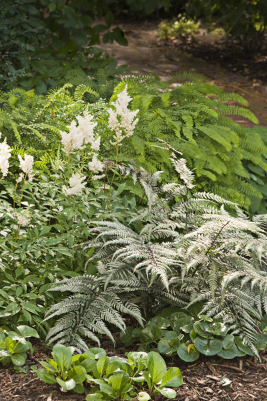 Ferns are also given their due here, with many design combinations suggested. [See first photo at left for a deer-resistant shade garden.] For woodland gardens, the ghostly Japanese painted fern (Athyrium niponicum) could be paired with silver-spotted lungworts (Pulmonaria) and maroon-leaved selections of coral bells (Heuchera).