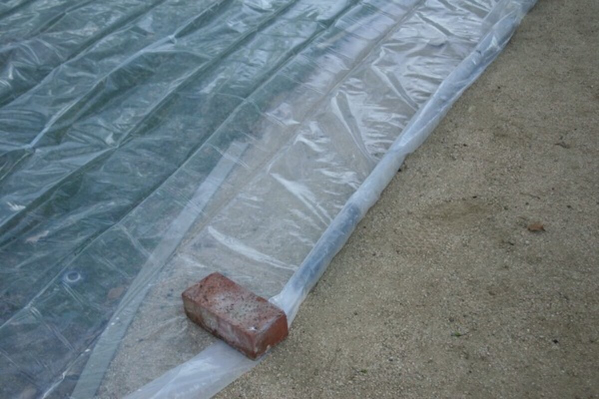 - Anchor around the edges of the plastic with rocks, bricks, wood planks, mounds of soil, etc.