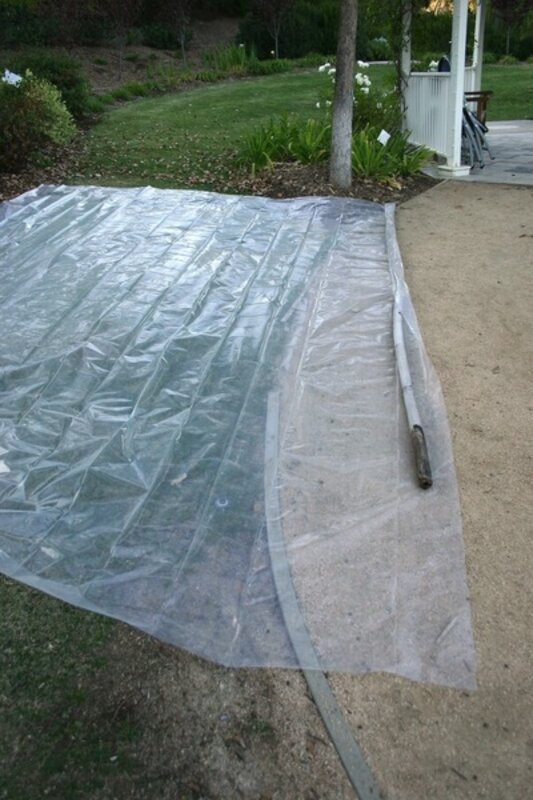 - Cover the lawn with 2 to 4 mil clear plastic (see note below) sheeting (available in the paint section of the hardware store. This is the most environmentally "unfriendly" part). Spread the plastic so it is in contact with the soil surface, and leave as little air space as possible
