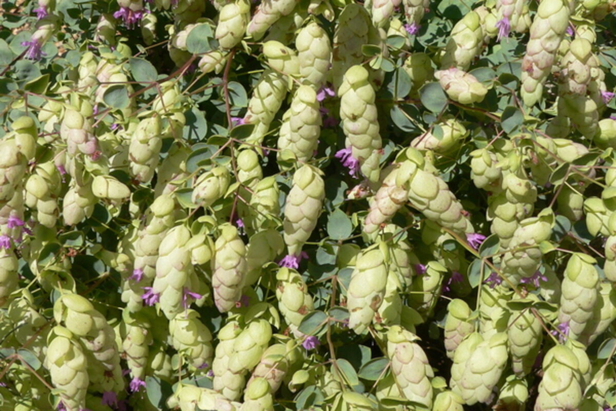 Origanum libanoticum, the Lebanese or hopflower oregano [see second photo above; click on arrow at right base of first photo], has narrow, chartreuse, shrimplike bracts with small, protruding lavender flowers.