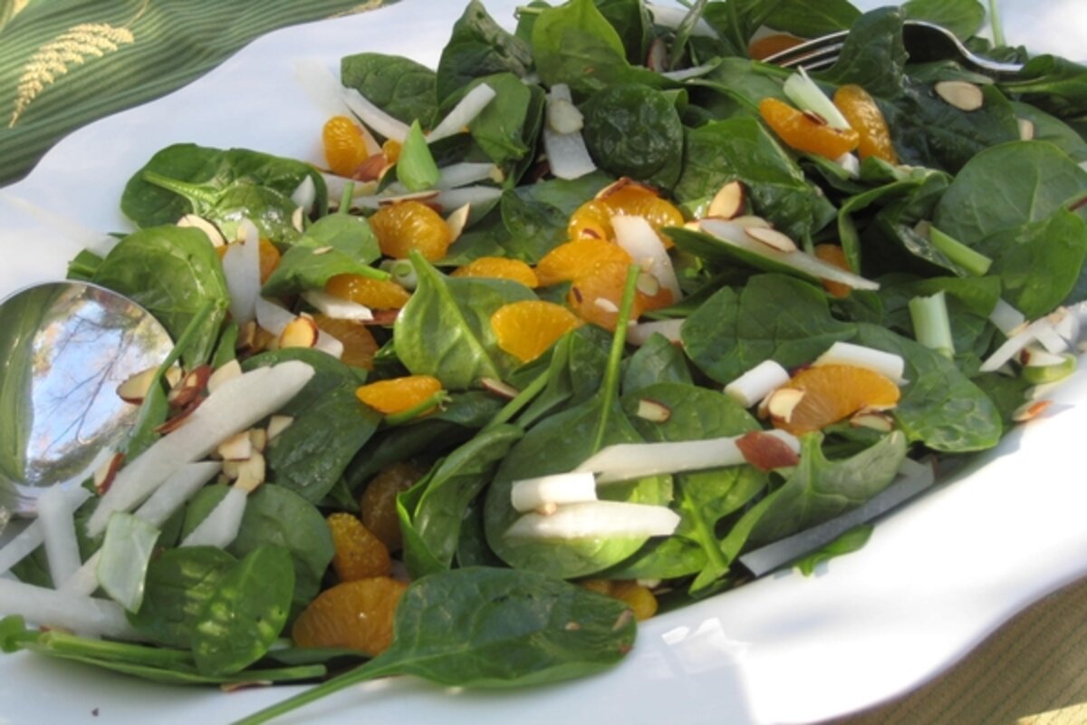 This recipe is versatile. After using spinach for the greens, I added mandarin oranges , sliced green onions, and toasted almonds, along with the daikon, but you can use your favorite salad greens, and replace the mandarin oranges with shredded carrots, pears, apples, or any other vegetable or fruit that will complement the daikon.