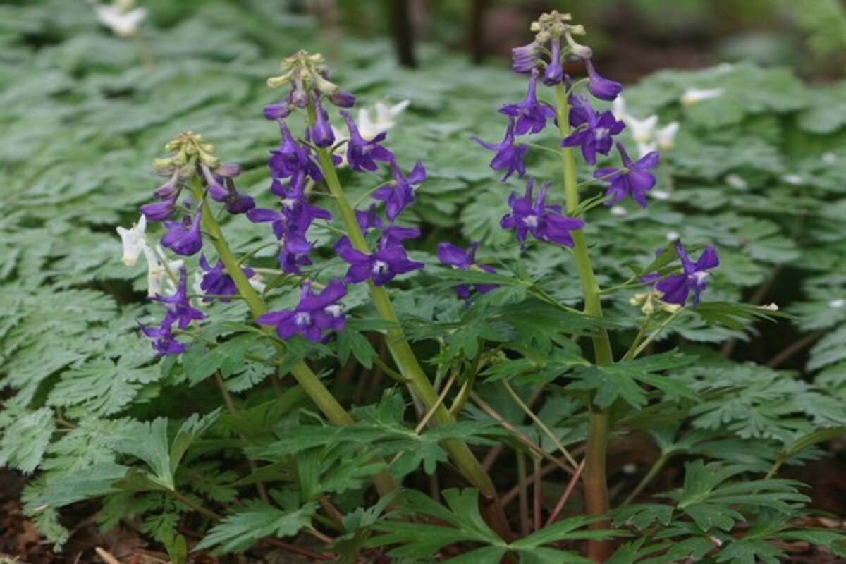 Delphinium tricorne is ephemeral, so as quickly as it comes up and blooms, it will fade away --听 as leaves come out on trees and shrubs, robbing it of light and nutrients. I have several other ephemerals located with the dwarf larkspur, such as trilliums, 听Dicentra cucullaria (Dutchman's听 breeches), and Dicentra canadensis (a perennial know as squirrel corn).