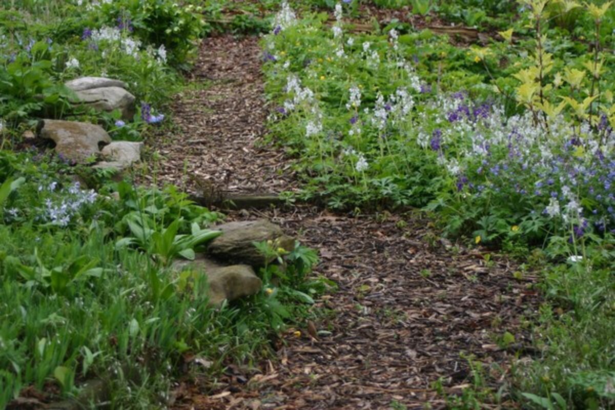 These drifts are located between and beneath shrubs or larger perennials that will emerge as the ephemeral plants go dormant, taking their place in the garden. Ferns are always good choice as a companion to dwarf larkspur, as are Dicentra exima (bleeding heart) for later blooms and lacy foliage, Heuchera (alumroot and coral bells) for large colorful leaves, and Polygonatum (Solomon's seal) for height and grace.