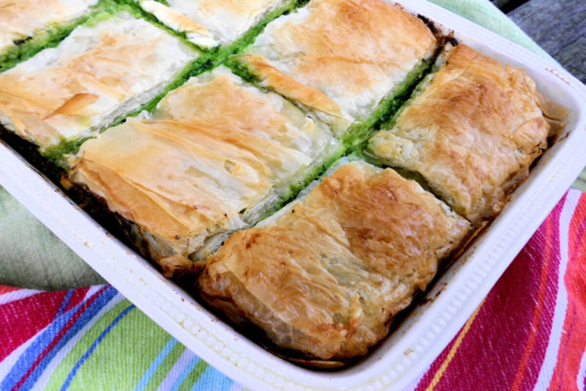 In the buttered baking pan, add 8 layers of phyllo dough, brushing each layer with butter. Spread 2 cups of the spinach-cheese mixture over the phyllo. Add 8 more layers of phyllo dough, brushing each layer with butter. Spread 2 more cups of spinach-cheese mixture, and layer again with 8 buttered layers of dough. Spread the final 2 cups of the spinach-cheese mixture, and then add 14 layers of phyllo dough, brushing each layer with butter and making sure you brush the top layer with butter as well. Cut the pastry into equal pieces with a sharp knife and bake for 40 minutes or until top is golden brown. Let rest 20 minutes before serving. Serves 6 to 8.