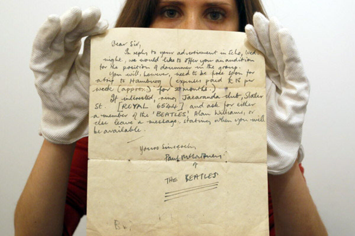 The letter, to be auctioned next month by Christie's, has surprised Beatles scholars. It was written two years before the band bounced drummer Pete Best in favor of Ringo Starr, who arrived just in time to help the Beatles' conquer first England and then the world, earning untold millions along the way.