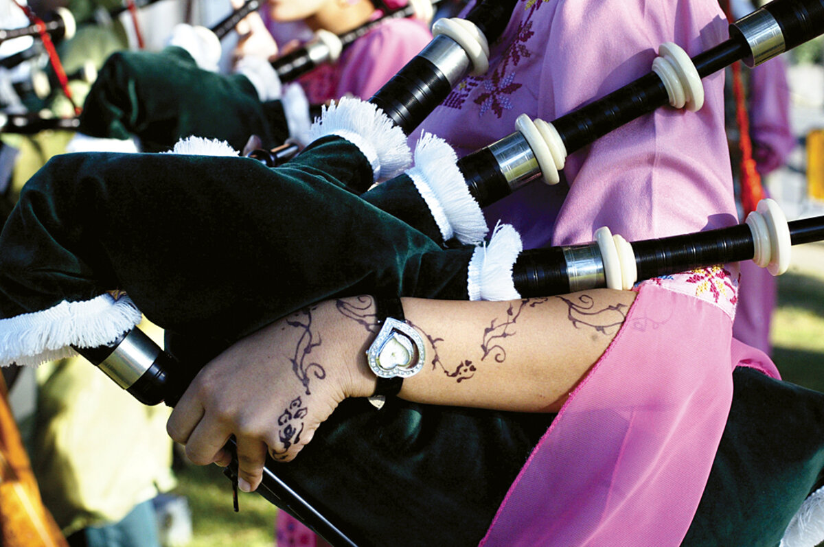 After years of well-meaning, but often misguided, self-instruction, a trained musician taught the students the correct way to play. Then, after performing in Lorient in 2006, came another, more tangible gift: The mayor of Brittany in France promised 10 new bagpipes at the cost of 2,000 euros each.