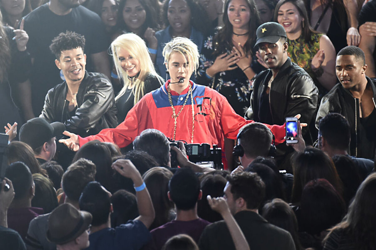 Justin Bieber was the first to perform, showing off his new dreadlocks during a mash-up of "Love Yourself" and "Company." He returned to the stage twice as a winner, claiming male artist of the year and sharing in the dance song of the year award with Diplo and Skrillex for "Where Are U Now."