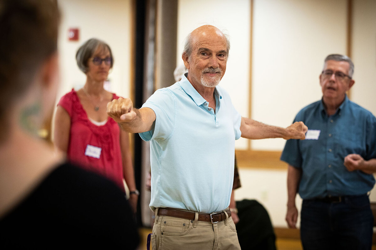“It’s really all about following. Following well,” organizer Peter McLoughlin explains to the group between exercises. Mr. McLoughlin is not a teacher or a director. He gently sets the group in motion, and then blends into the circle as a participant.