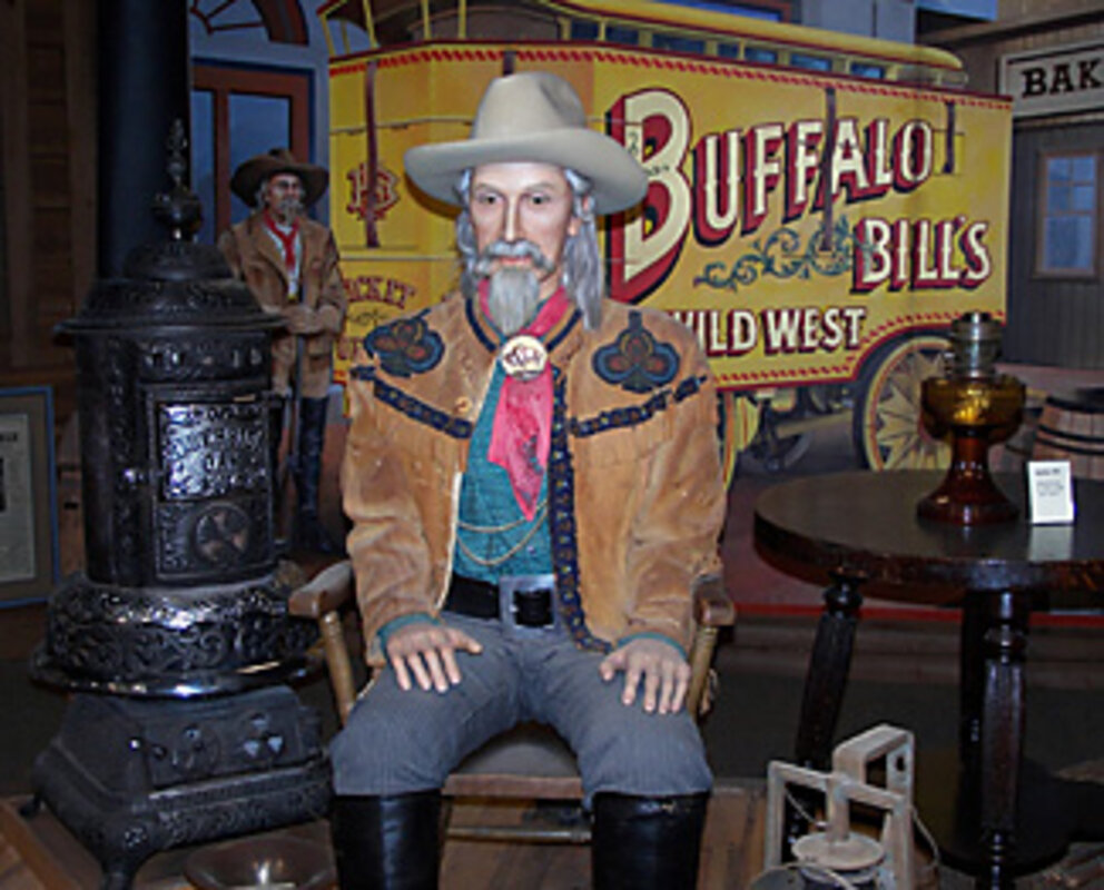 Sightseers can take a look at a woodcarving of Buffalo Bill and see one of his famous Sharps rifles. William Cody (Buffalo Bill's real name) was known all over America in the late 1800s and early 1900s for his touring Wild West shows. There's even a life-size bison figure that was used as a prop in the 1990 movie, "Dances with Wolves," which included the story of the near-extinction of the North American bison in the late 19th century.