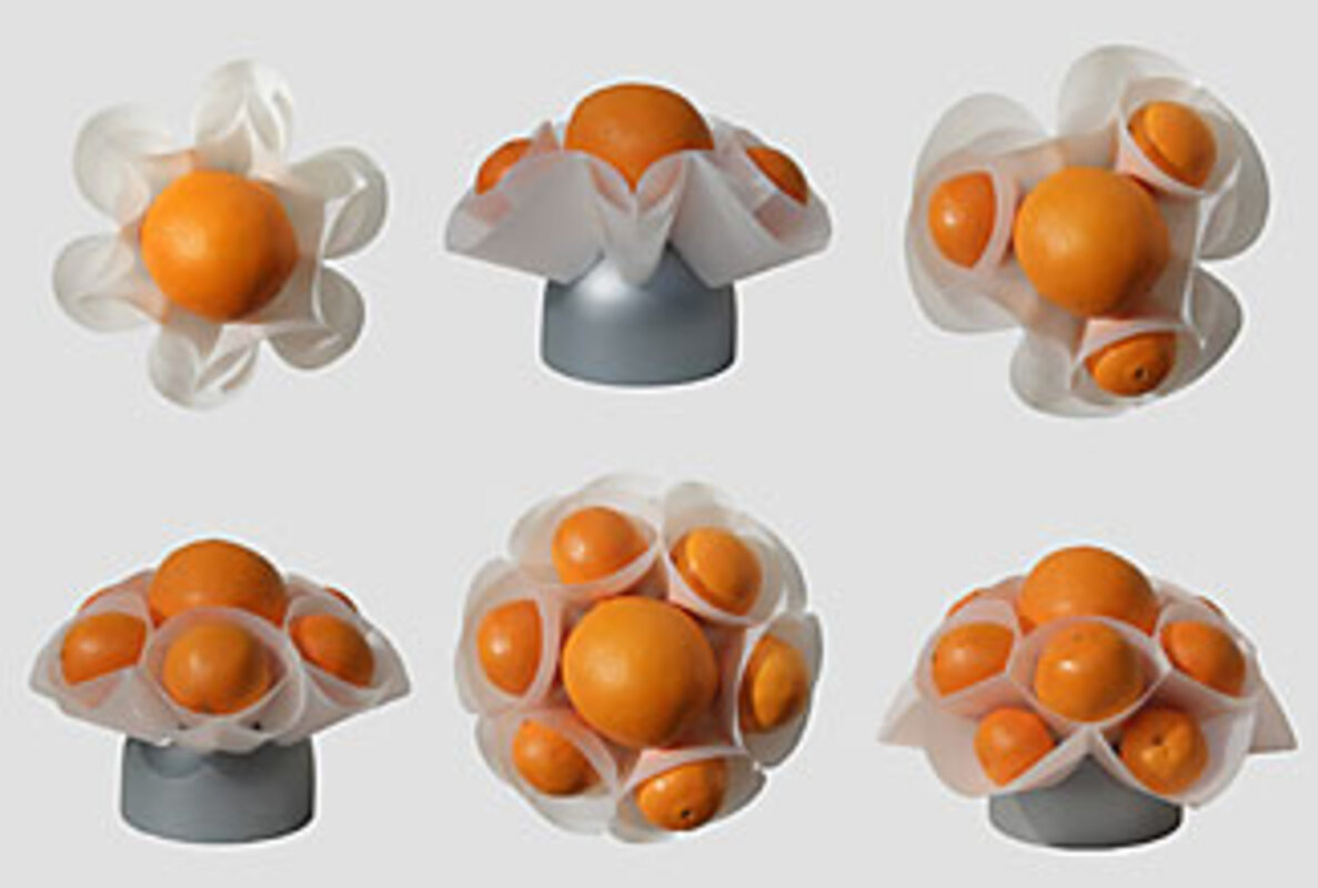 Sarah spent weeks making sketches and models. A friend even helped her measure fruit at the grocery store. Her love of origami helped her think through the collapsible folds. "My dad used to work in Japan, and he would bring me back origami books," she says. "One year, we didn't have a Christmas tree at home, so I made a giant Christmas tree out of origami, with origami ornaments to put on it."
