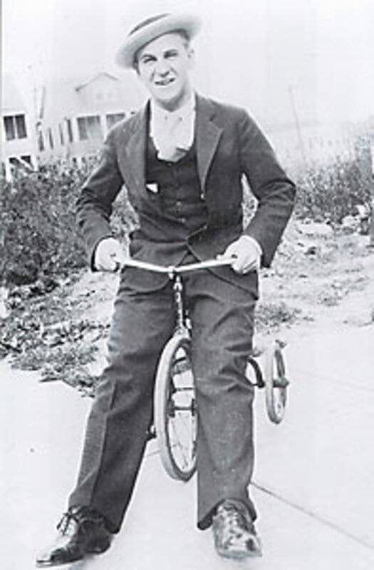 One is of my dad standing on both feet but seated on a small tricycle that he is holding up as if he were riding it. He is 20 and wearing a dark pinstriped suit and vest, a white dress shirt, and a light-colored tie. On his feet are laced dress shoes, on his head a straw hat, and on his face a silly grin.