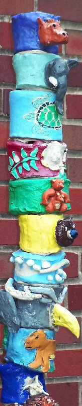 One outdoor project 鈥 three totem poles 鈥 was created by three different fifth-grade classes. The animals on these totem poles were designed using clay in the shape of napkin rings (about two inches high). After firing the clay rings, Mr. Boland attached their surfaces with a strong adhesive. Then he put the attached clay figures through a pole of steel rebar set in a circular concrete platform.