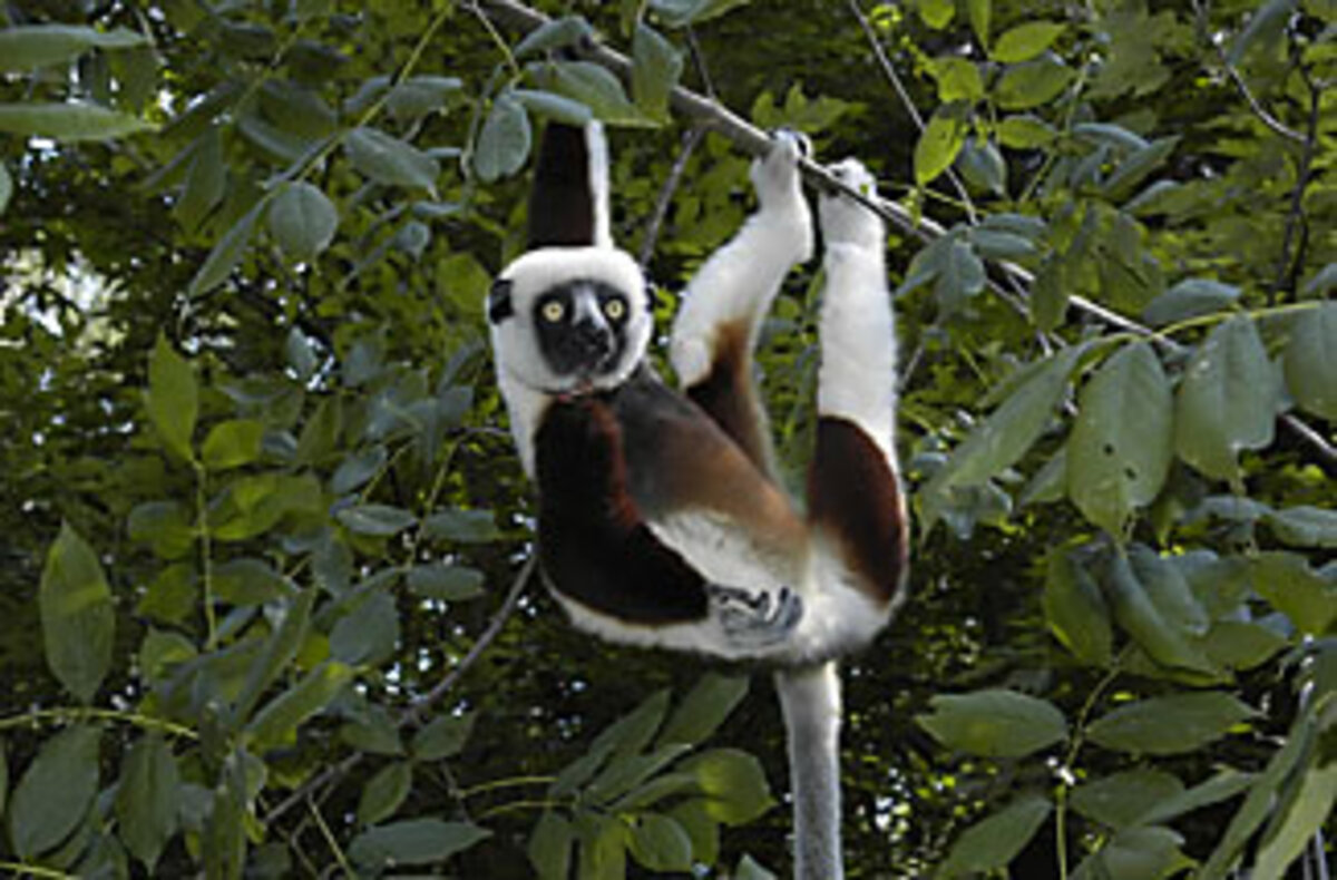 One of the most beautiful lemurs is the brown and white Coquerel's sifaka. This lemur leaps from tree to tree and can soar distances up to 20 feet. When they're on the ground, the sifakas, unlike other lemurs, hop on two legs like kangaroos!