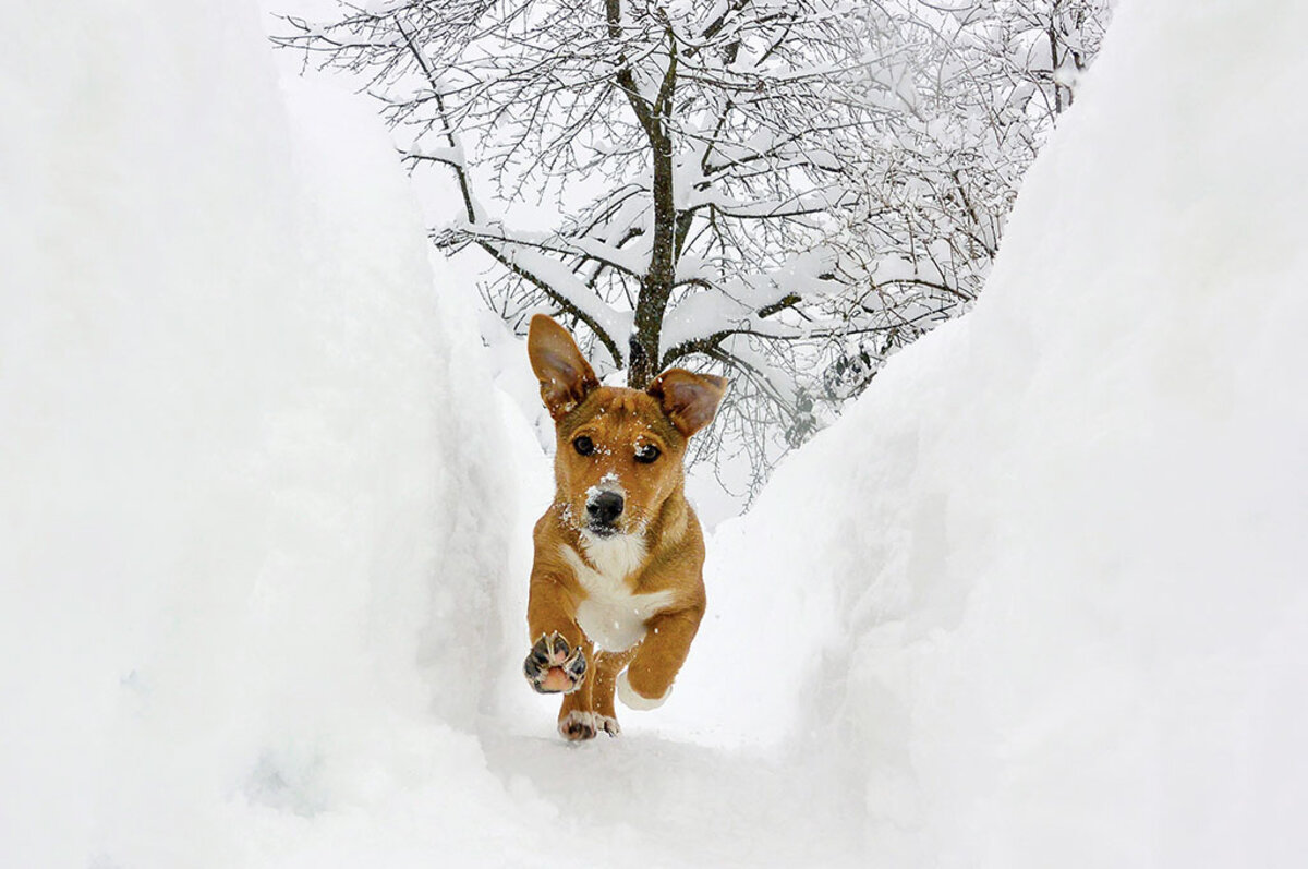 Rio and I walk a block through our neighborhood to the trailhead. It鈥檚 guarded by a 12-foot-high snow berm; the snowplow guy has been working hard. I chide myself for forgetting my snowshoes as I clamber around the icy wall, feet planting postholes in the snow. Rio leaps happily into the powder, which is up to his neck. He bobs up and down like a sea serpent through the trees.