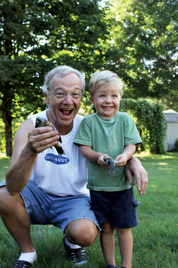 A decade or so later, I am sitting next to him on a porch swing, a different lake shimmering in front of us. My own children are splashing in the water, a ways out from the pontoon where a mess of rods he鈥檇 earlier baited with worms rests drying in a corner. He has slung his arm around my shoulder. His face, when I look up at him, is tanned and content, watching grandkids now instead of bobbers. He is older. Sometimes I鈥檒l allow myself to see it: his white hair, the increasing repetition of certain questions and anecdotes, his drifting, my worry. More often, though, I鈥檒l let that line go slack 鈥 catch, release.