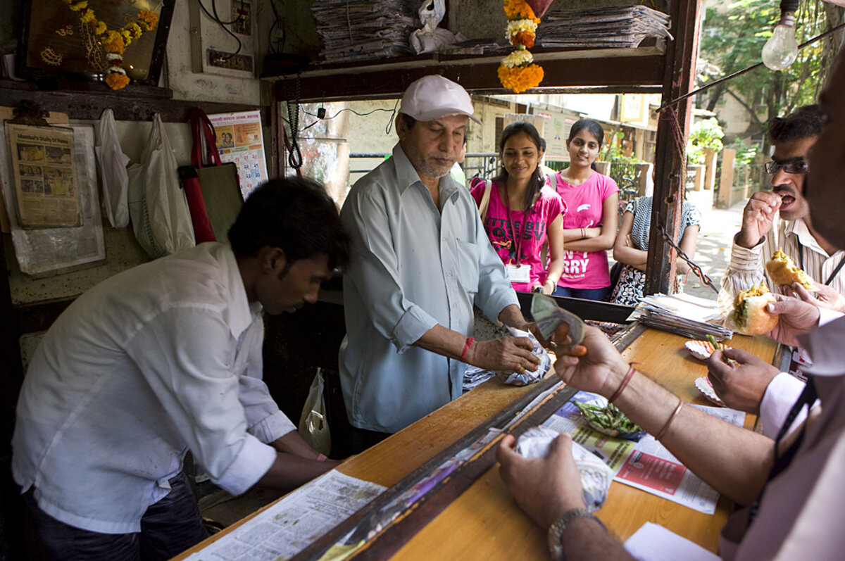 At this particular stall, named Ashok's, any chickpea mix drippings are added to the plate, somewhat like French fries. Ashok's sells about 1,000 vada pavs a day, at 22 cents apiece. They come wrapped in sheets of newspaper. I spy one headline: "Beating cyber insecurity."