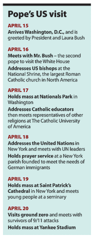 The pope, who arrives Tuesday evening, will meet with President Bush and with Catholic bishops on Wednesday, speak to Catholic educators and to representatives of other faiths on Thursday, and address the UN on Friday. He'll also offer mass to thousands at Nationals and Yankee stadiums and visit ground zero.